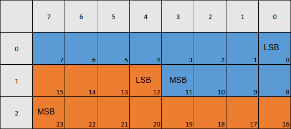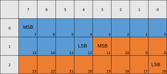 Here the columns represent bit numbers, and the rows represent byte numbers. LSB marks the first (least significant) bit of the value, and MSB marks the last (most