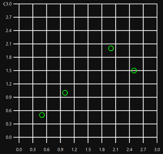 GraphsView { anchors.fill: parent axisX: ValueAxis { max: 3 } axisY: ValueAxis { max: 3 } ScatterSeries { color: "#00ff00" XYPoint { x: 0.5; y: 0.5 } XYPoint { x: 1; y: 1 } XYPoint { x: 2; y: 2 } XYPoint { x: 2.5; y: 1.5 } } }