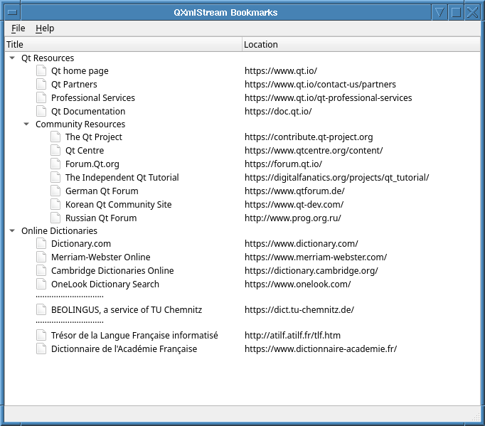 The QXmlStream Bookmarks example provides a viewer for XML Bookmark Exchange Language (XBEL) files. It can read bookmarks using Qt's QXmlStreamReader and write them back out again using QXmlStreamWriter. As this example aims to show how to use these reader and writer types, it provides no means to open a bookmark, add a new one, or merge two bookmark files, and only minimal scope for editing bookmarks. None the less, it could surely be extended with such features, if desired.