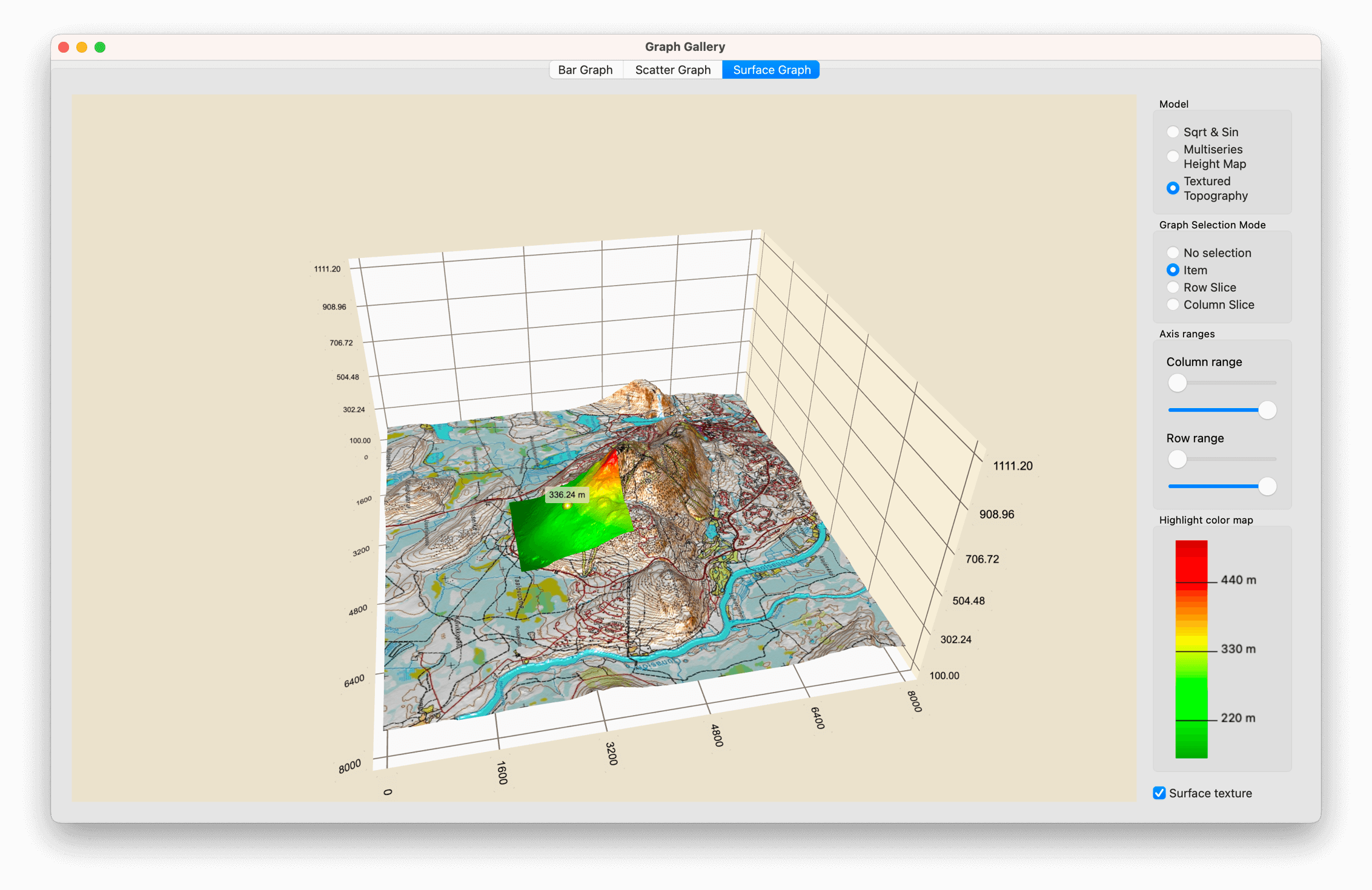 Since the HighlightSeries is QSurface3DSeries, all the decoration methods a series can have are available. In this example, add a gradient to