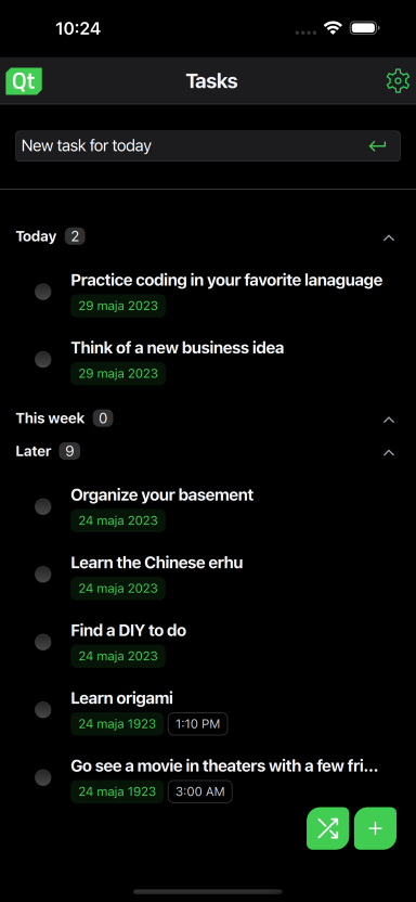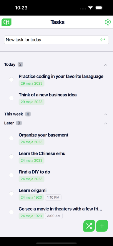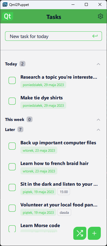 To Do List demonstrates a sample to-do list application that looks native on any platform. The example can be run and edited in both QtDesignStudio and QtCreator. It shows how to create and use a custom style, how to use settings to control the appearance and behavior of the application. It also presents how to implement simple drag and drop behavior on delegates. The application uses local storage to store items on the device and XMLHttpRequest to retrieve data from the public API (Random Tasks functionality). The views are controlled by StackView component.