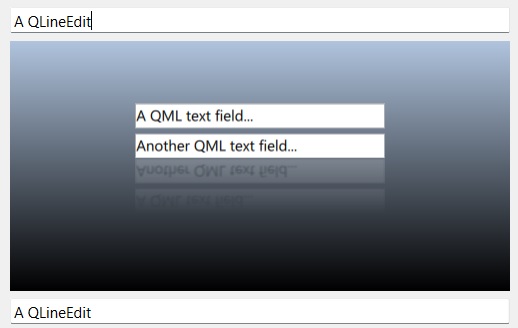 Embedding the window internally leads to creating a native child widget inside the widget hierarchy, and the window (the QQuickView in the example) is reparented. The container widget takes care of repositioning the child window so that it appears to be part of the user interface, even though in reality it is separate native window that paints independently from its parent, the QWidget-based top-level window.