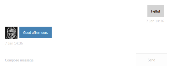 anchors.right to listView.contentItem.right.visible property of the avatar (which is simply a Rectangle for now) based on sentByMe, we only show it if the message was sent by a contact.At the bottom of the screen, we place a TextArea item to allow multi-line text input, and a button to send the message. We use Pane to cover the area under these two items, in the same way that we use ToolBar to prevent the contents of the listview from interfering with the page header: